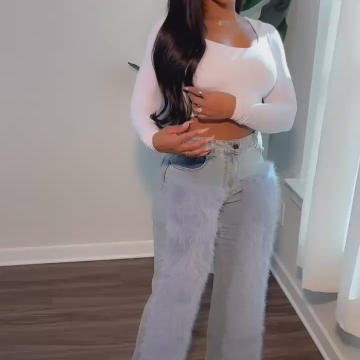 HIGH WAISTED DENIM FAU FUR FRONT DETAILS PANTS. MODEL IS WEARING SIZE SMALL Model Measurements Weight 135 Height 5'2