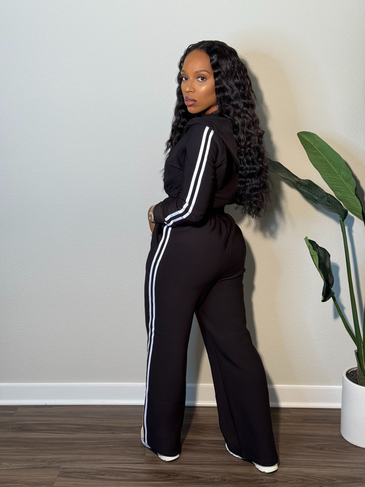 ON THE TRACK HOODED JUMPSUIT -Hooded -Front Zipper -Elastic Waist -Lined Fleece -Side Stripes -Wide Leg (Tall Girl Friendly)  ...